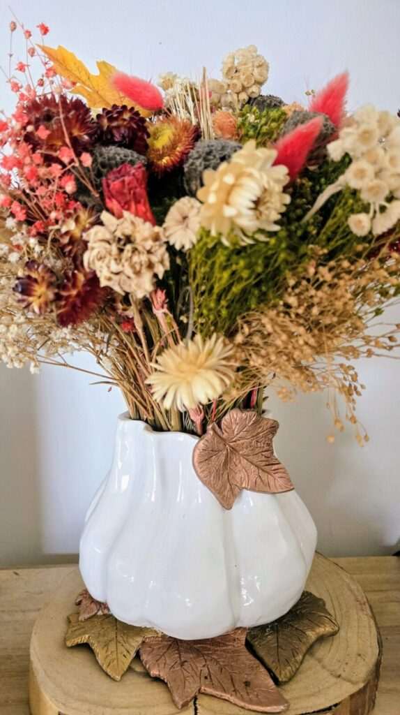 That doesn’t stop me from feeling the autumn spirit. This October, I brought out my seasonal decorations — a mix of my own autumn ceramics, crafted in stoneware and earthenware, and pieces from other artisans.I especially love my butternut-shaped vase, which I created two years ago and filled with dried flowers in autumn tones.