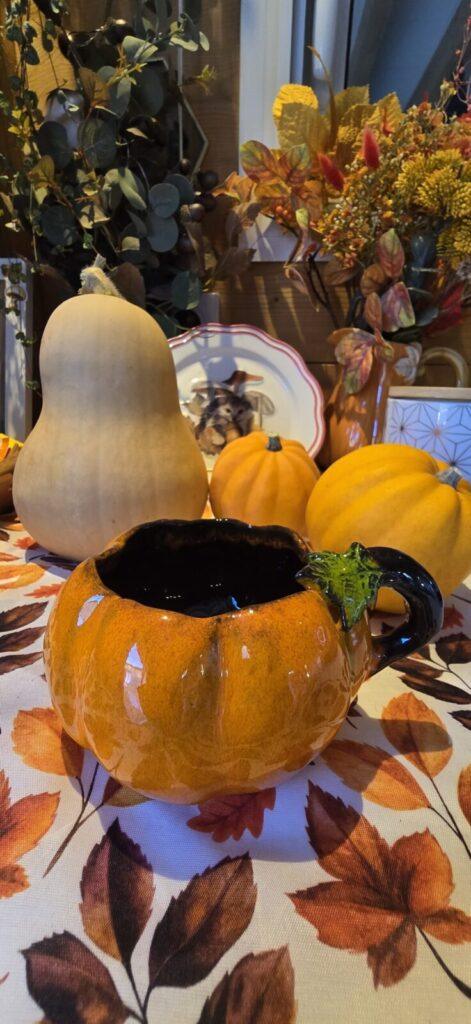I confess — I’m a collector of seasonal mugs! My wall shelves are now filled with a joyful mix of handmade, vintage, and found autumn mugs. Every day, I love choosing the mug that matches my mood, and I enjoy seeing which one my guests are drawn to. It’s my little daily pleasure! My favorite at the moment is my pumpkin-shaped mug, which I made last year — I especially love its glaze.