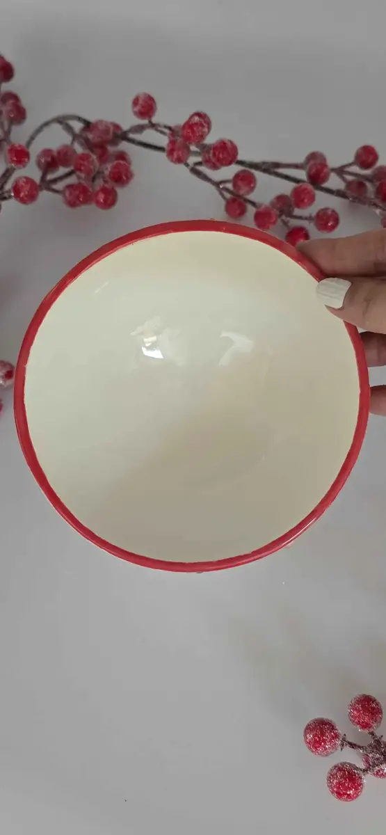 Deux liserés rouges viennent structurer la forme du bol : l’un souligne élégamment le bord supérieur, l’autre encadre le pied. Ce dernier est délicatement rehaussé d’un liseré d’or, apportant une touche lumineuse et raffinée.