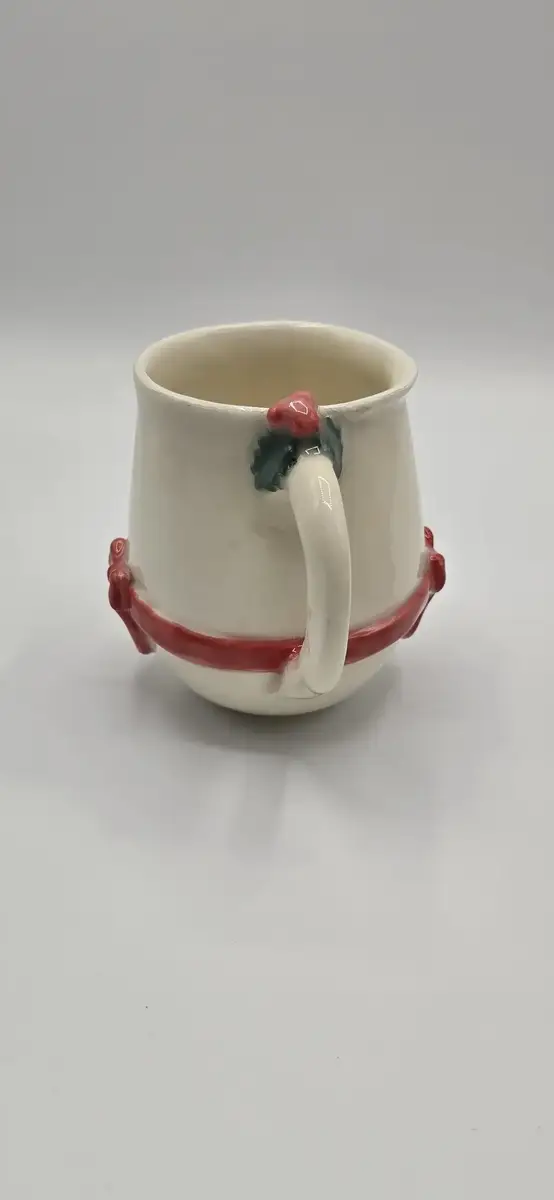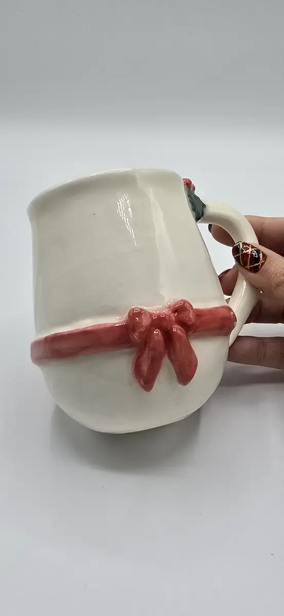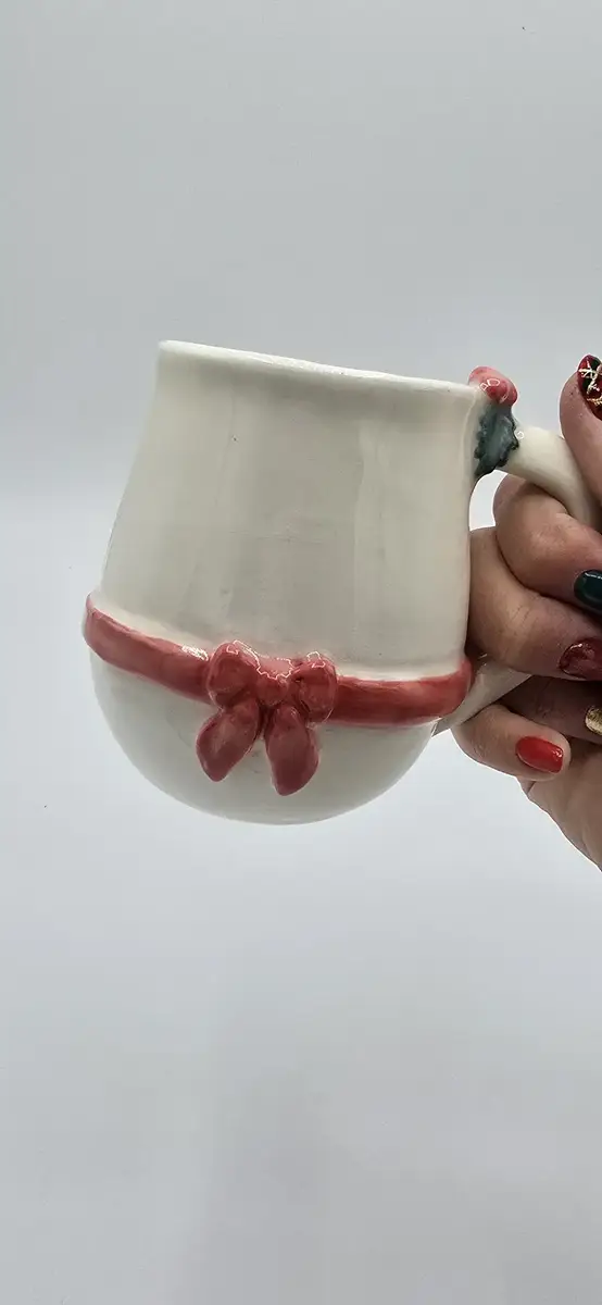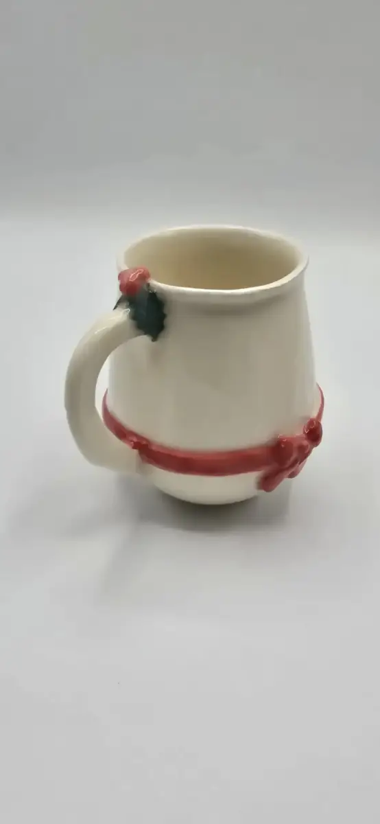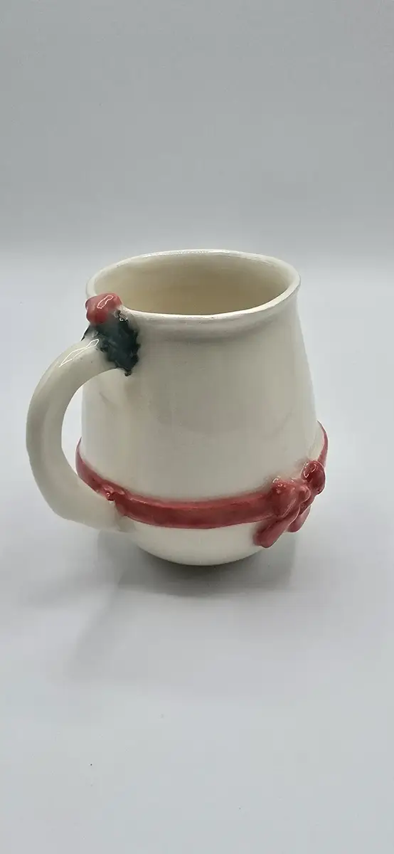 Juste au-dessus de la anse, une petite branche de houx modelée à la main vient compléter la décoration : un clin d’œil chaleureux aux traditions de Noël.
