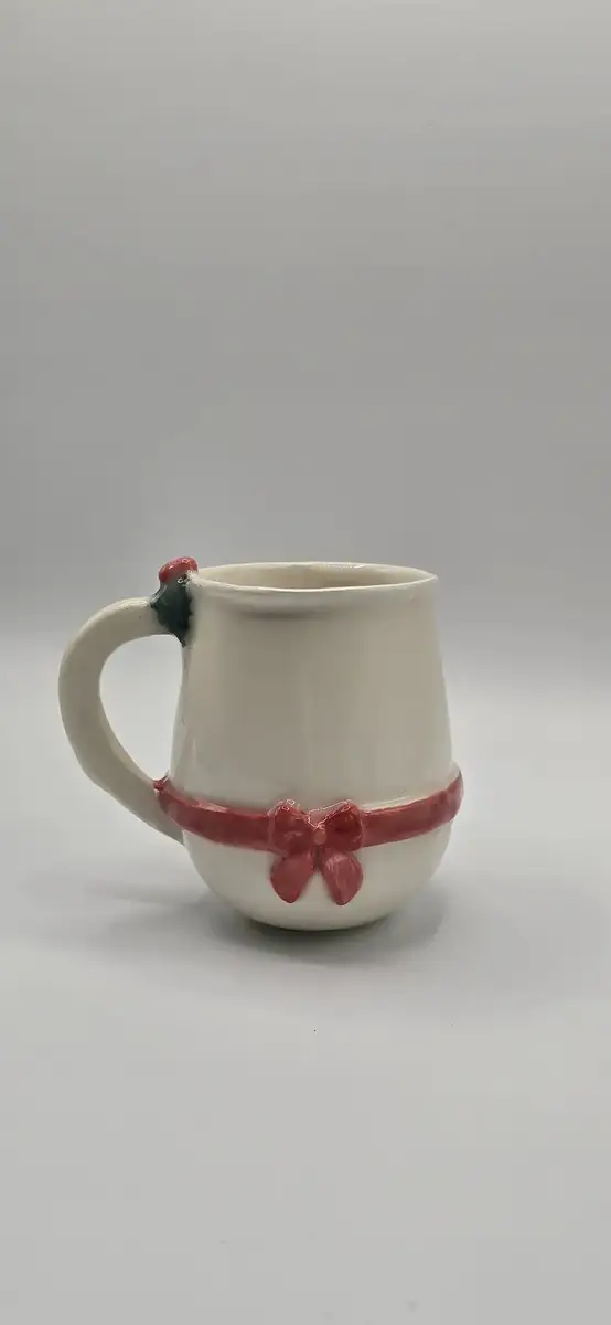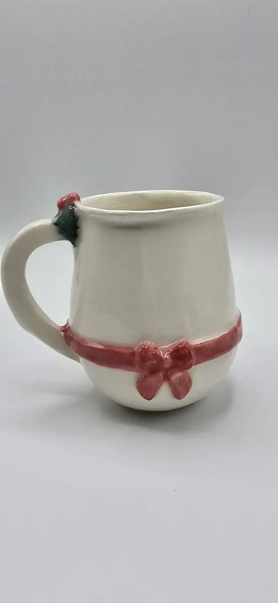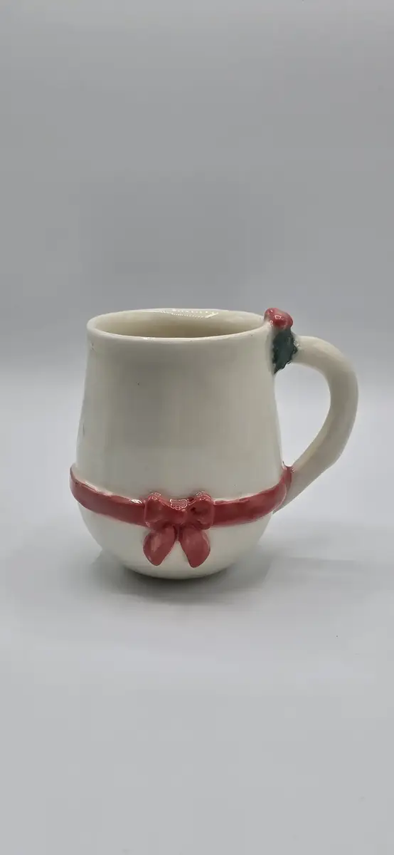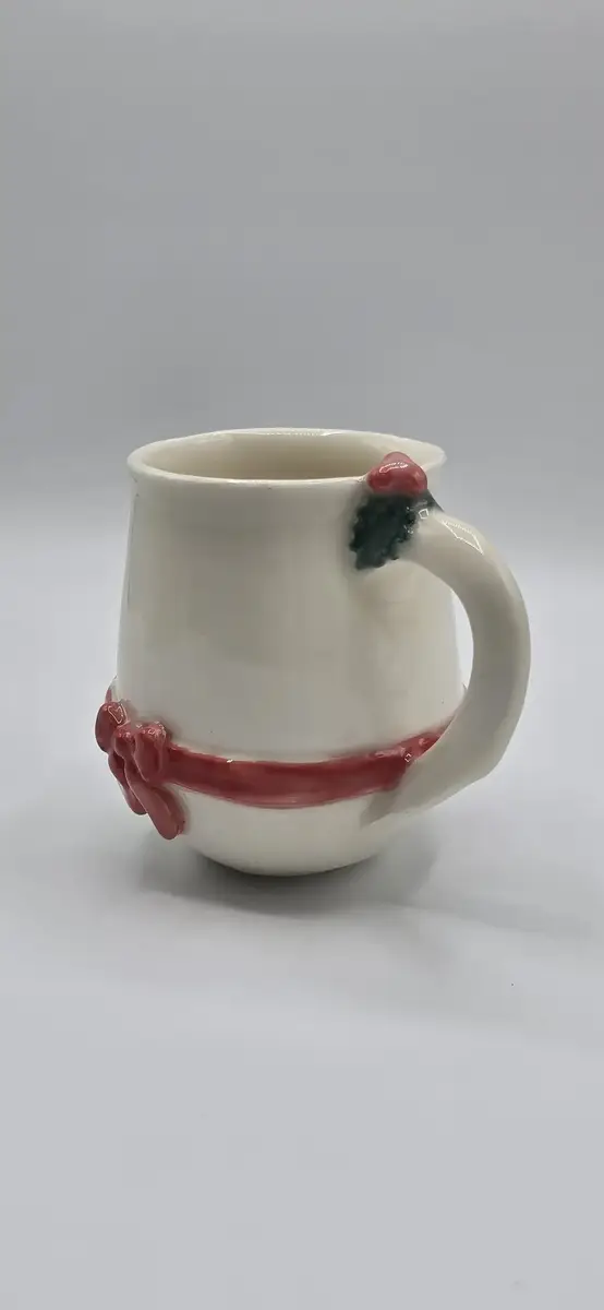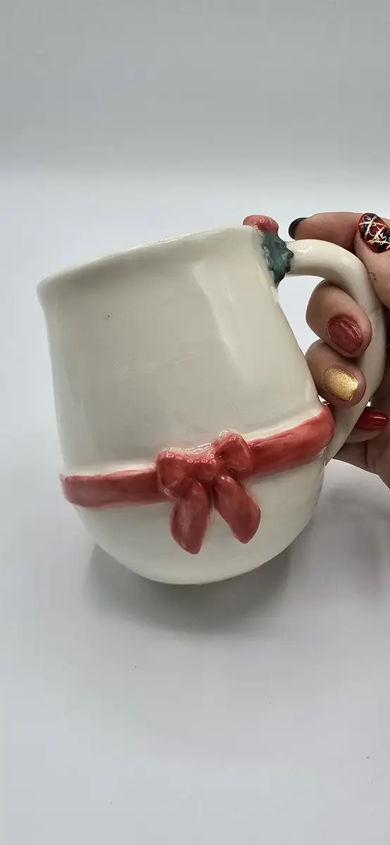 Juste au-dessus de la anse, une petite branche de houx modelée à la main vient compléter la décoration : un clin d’œil chaleureux aux traditions de Noël.