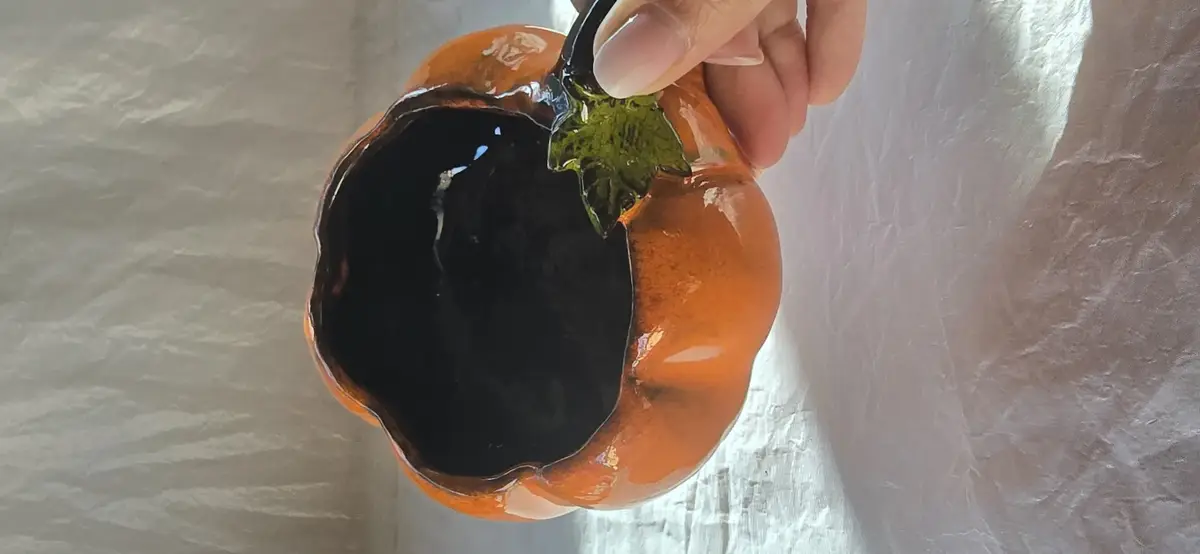 Sa hanse noire contraste élégamment avec la feuille verte délicatement posée sur le dessus, pour une vaisselle 100% automnale.