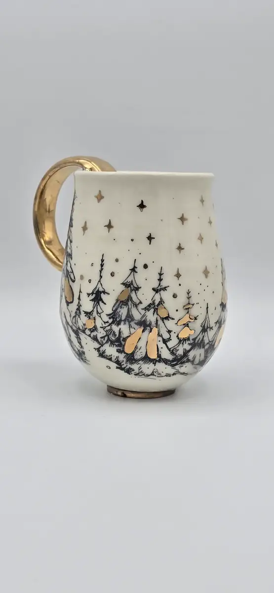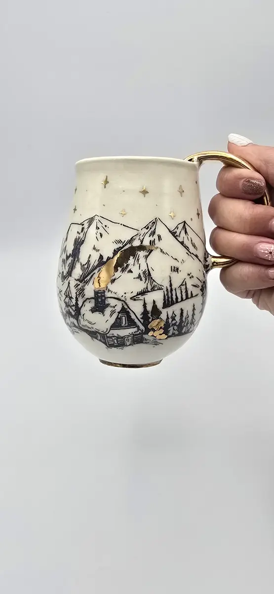 Sur toute la surface extérieure du mug se déploie un paysage de montagne enneigée, décoré à l’engobe noir : des sommets montagneux, des sapins couverts de neige et un petit chalet niché au pied des montagnes, dont la cheminée fumante évoque la chaleur d’un refuge en altitude.