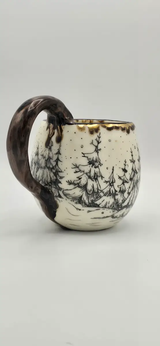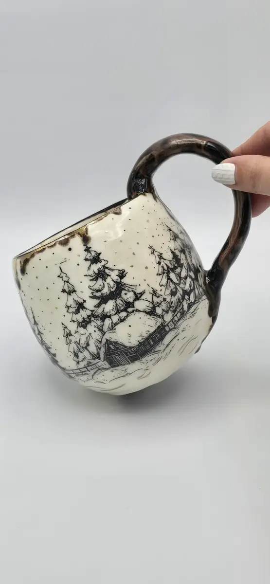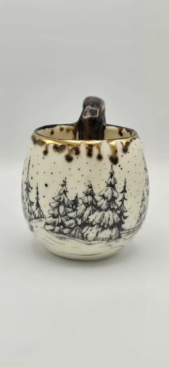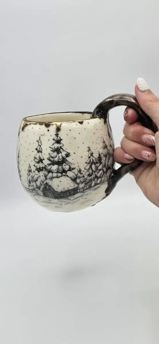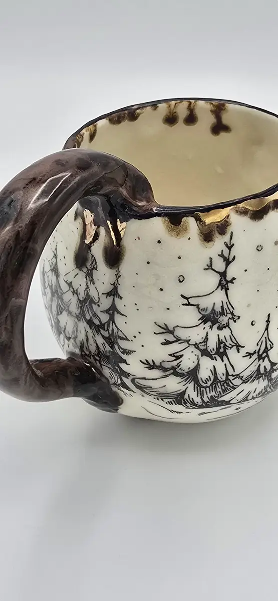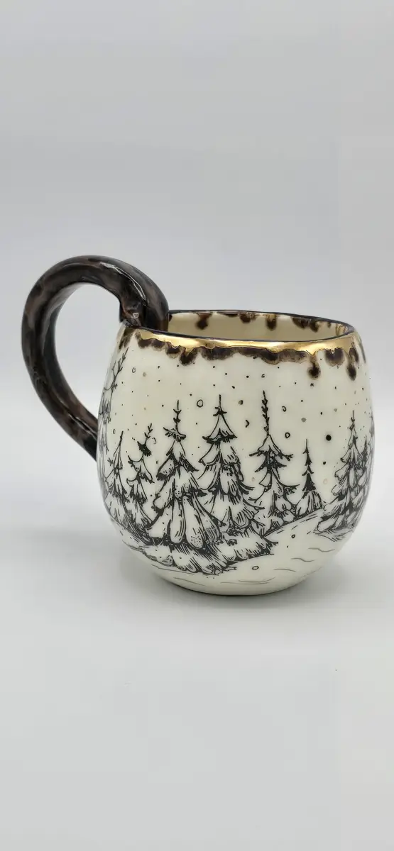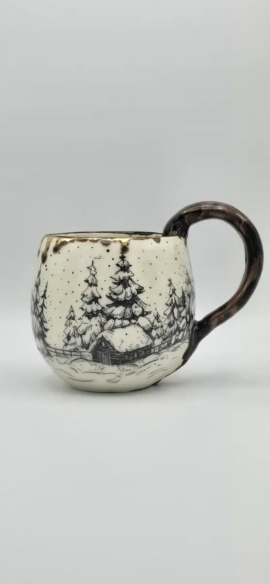 Le mug « Chalet dans la forêt enneigée » est une création en céramique artisanale, inspirée par les paysages hivernaux et l’atmosphère chaleureuse des refuges de montagne. Réalisé en faïence blanche, il est décoré à l’engobe noire, mettant en scène un chalet niché au cœur d’une forêt de sapins enneigés, dans une ambiance douce et enveloppante.