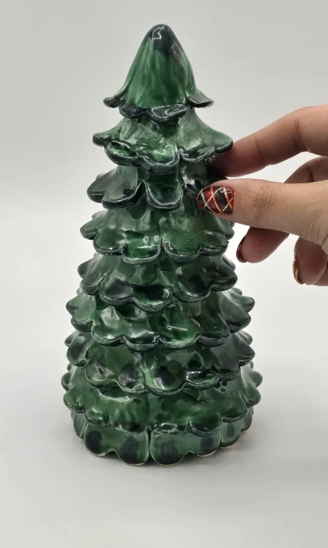 Chaque sapin est réalisé entièrement à la main. De légères variations dans le feuillage, dans les teintes, l’émail ou le lustre peuvent apparaître d’une pièce à l’autre, témoignant du caractère unique du fait main et du travail de la céramique artisanale.