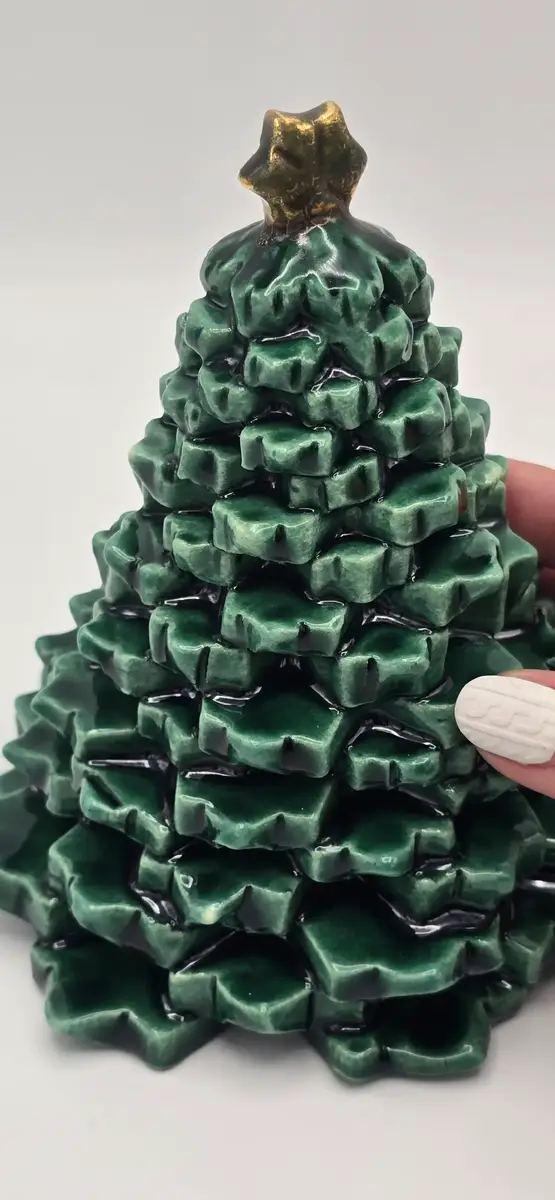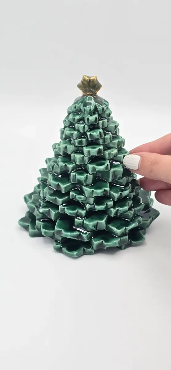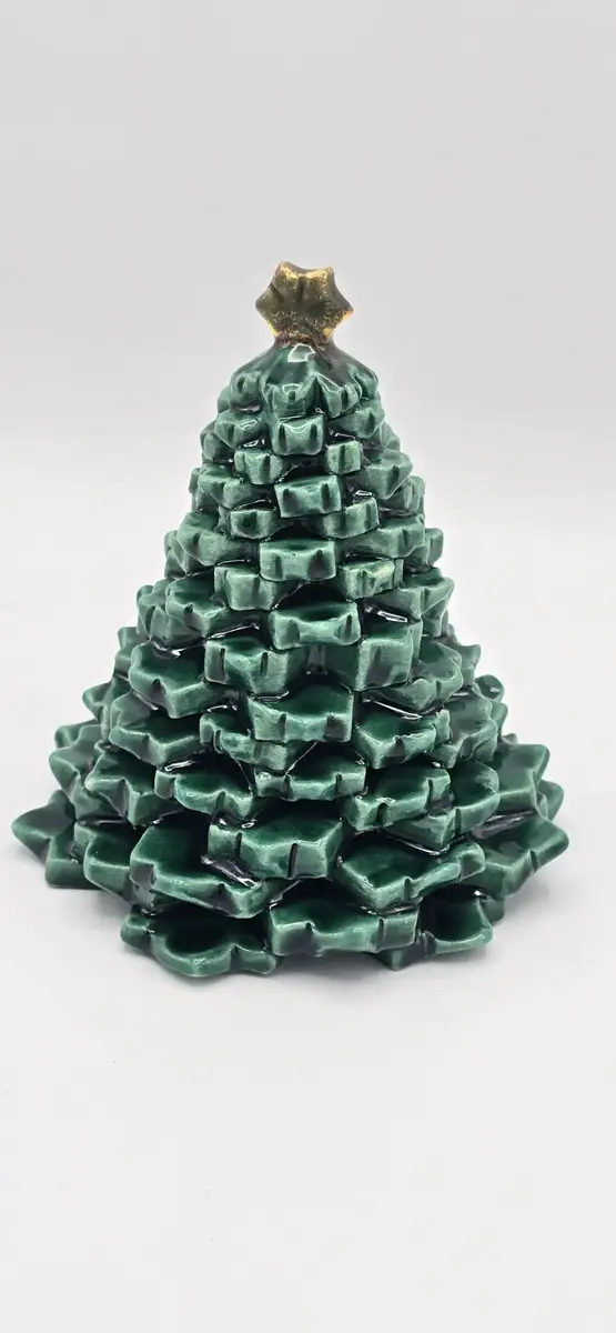 Chaque sapin est réalisé entièrement à la main. De légères variations dans le feuillage, dans les teintes, l’émail ou le lustre peuvent apparaître d’une pièce à l’autre, témoignant du caractère unique du fait main et du travail de la céramique artisanale.